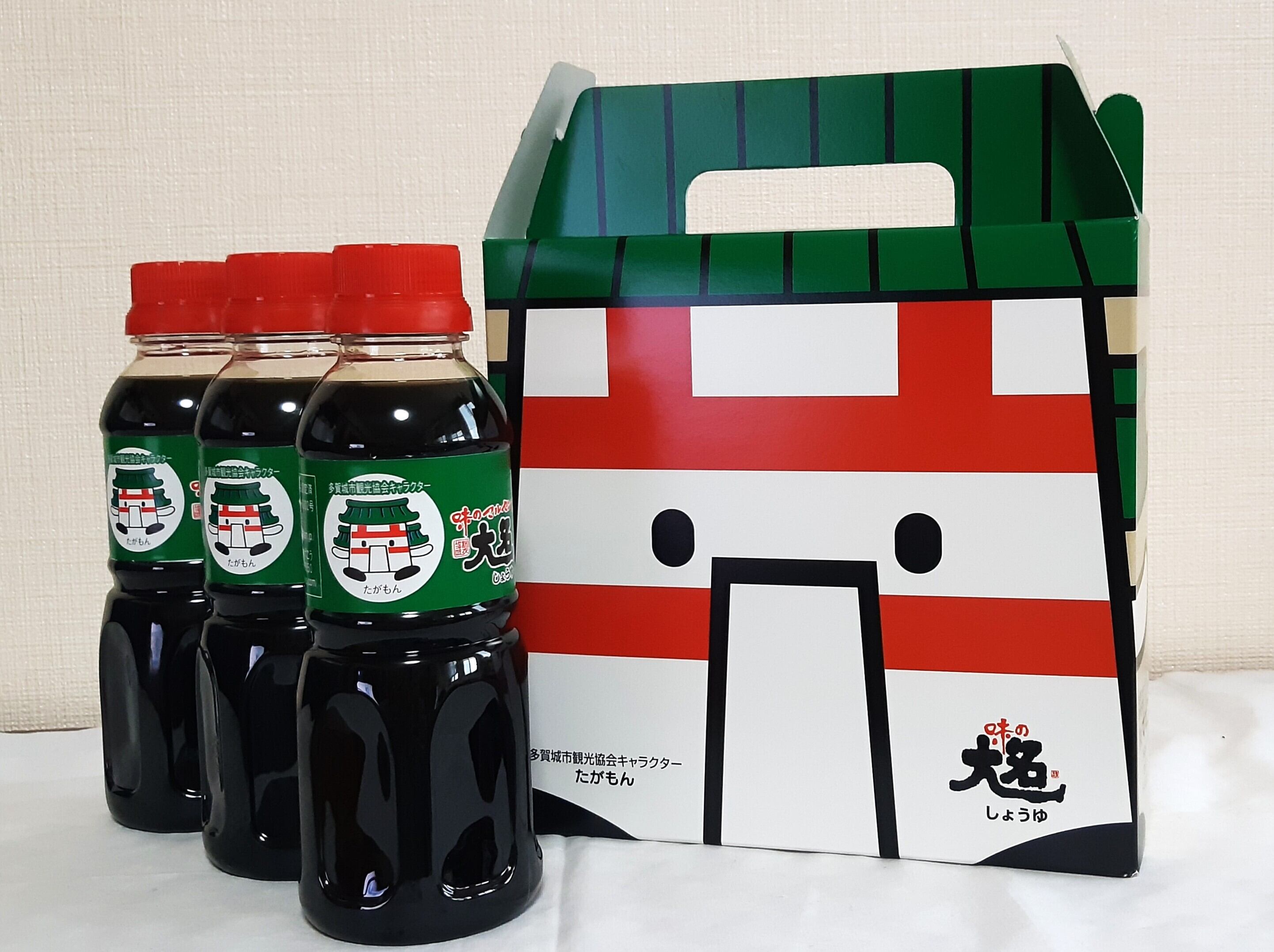 多賀城市観光協会のゆるキャラ「たがもん」パッケージの 大名醤油を楽しんでいただける特別セットです! 天童と多賀城の企業がタッグを組み、風味豊かな味付き醤油を地元のお土産品として作り上げました。300mlの本品は、卓上でもそのまま使いやすいジャストサイズ。