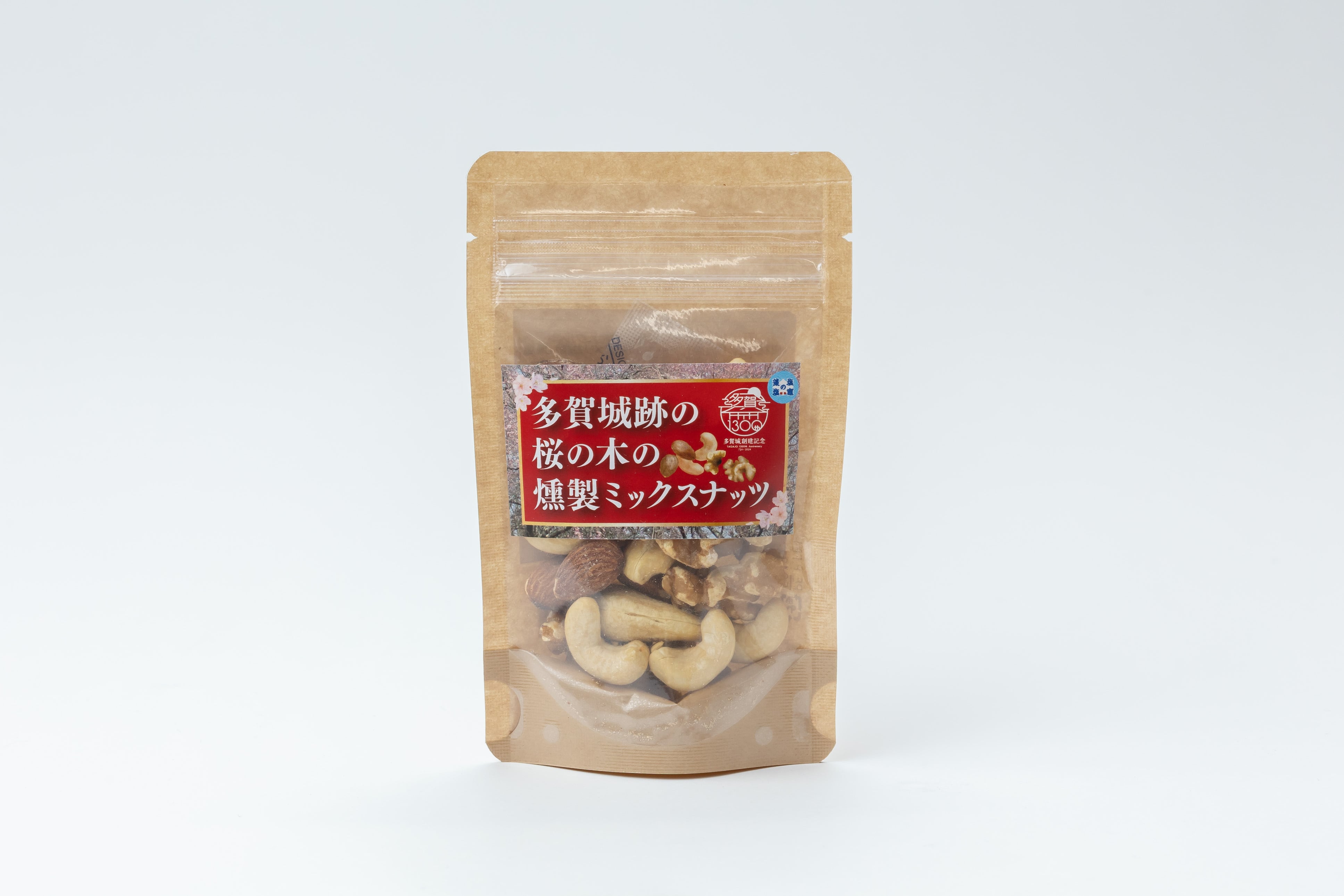 「多賀城跡の桜の木の燻製ミックスナッツ」は、多賀城南門の復元工事の際にやむなく伐採処分することとなった桜の木を用いて燻製し仕上げられたナッツです。